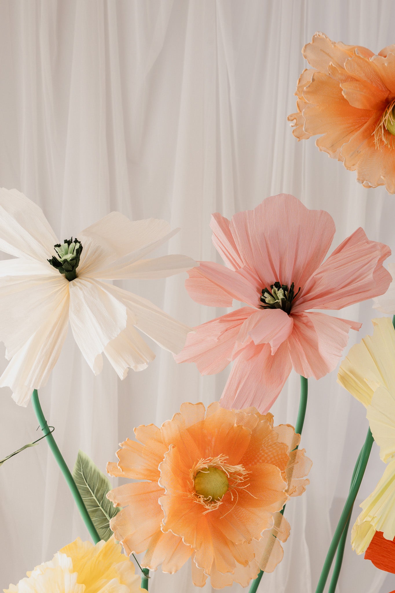 The floral installation features pale pink, champagne, cream, white, soft orange and yellow, so outfits in similar or coordinating shades photograph beautifully.